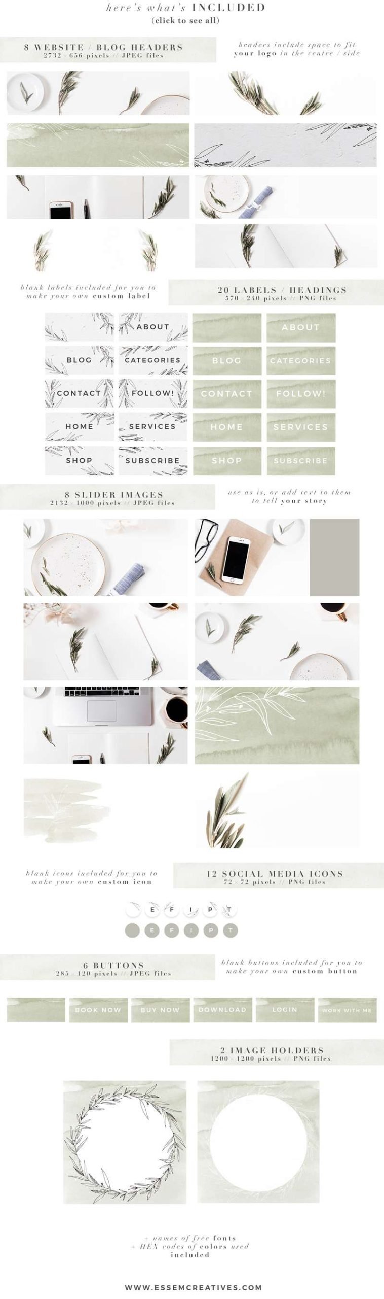 Botanic Neutral Website Blog Branding Kit, Olive Greenery Minimal Theme, Blogger Squarespace WordPress Design, Blog Headers Social Media Icons