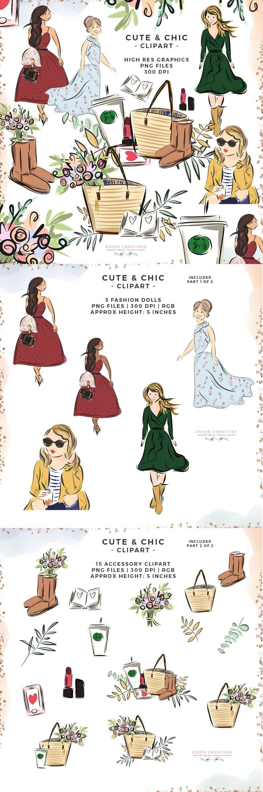 CUTE & CHIC is a set of digital graphics featuring girls/ fashion dolls in gorgeous dresses in gemstone colors, sipping coffee, farmer’s market bag, florals, autumn boots, an open book / journal, lipstick, coffee mug and iphone – all the essentials! Also includes girls in diverse skin tones and hair colors, including fair skin, dark skin & brown and hispanic skin tones.
