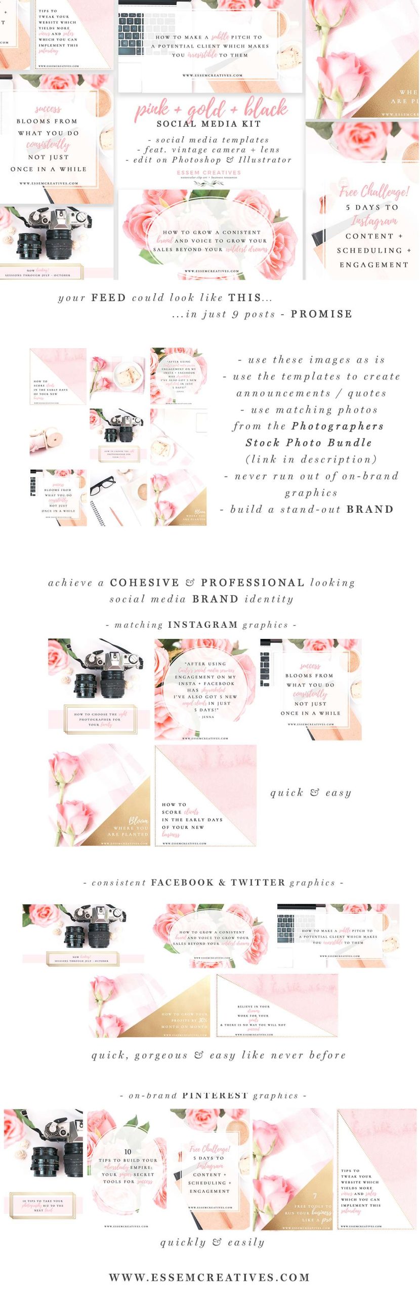 Pink Gold Black Social Media Templates are for social media branding & blog / website posts. With this kit, you can look stylish and professional, even if you don’t have a dedicated graphic design team. If you have been thinking about increasing your social media following & growing your brand, then look no further. This is to answer to all your prayers!