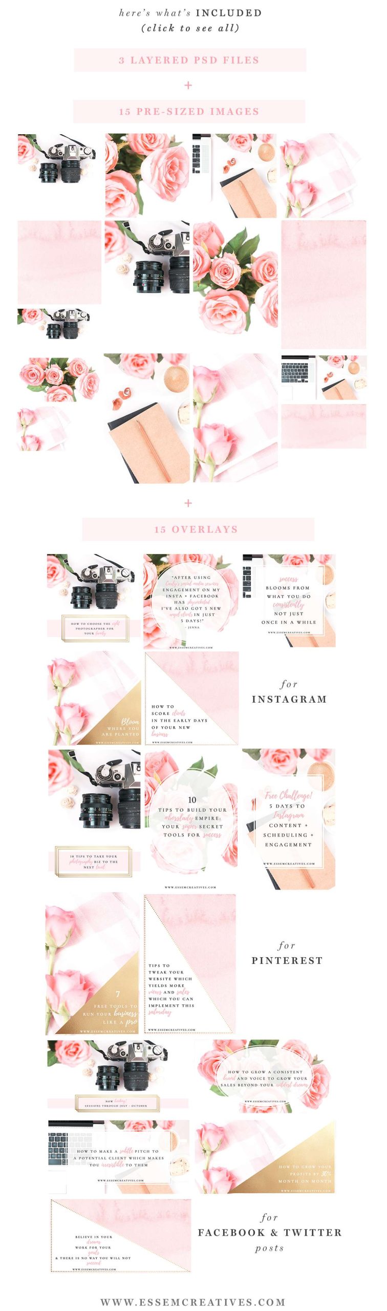 Pink Gold Black Social Media Templates are easy to use templates, stock photos & transparent overlays which will help you achieve a cohesive & consistent look for your brand. If you struggle with generating regular & on-brand content for your blog or social media handles, then this is the product you need. Your download includes: