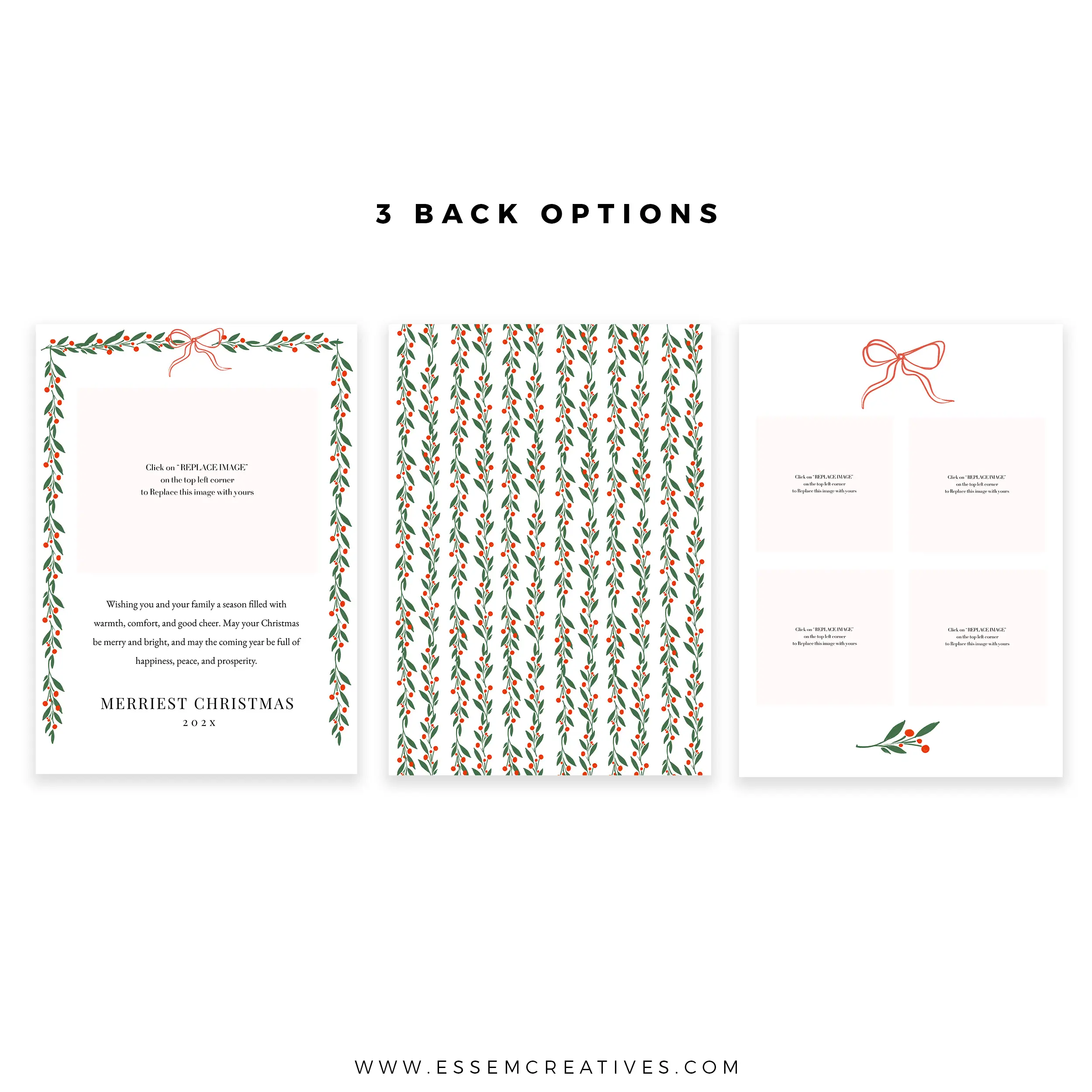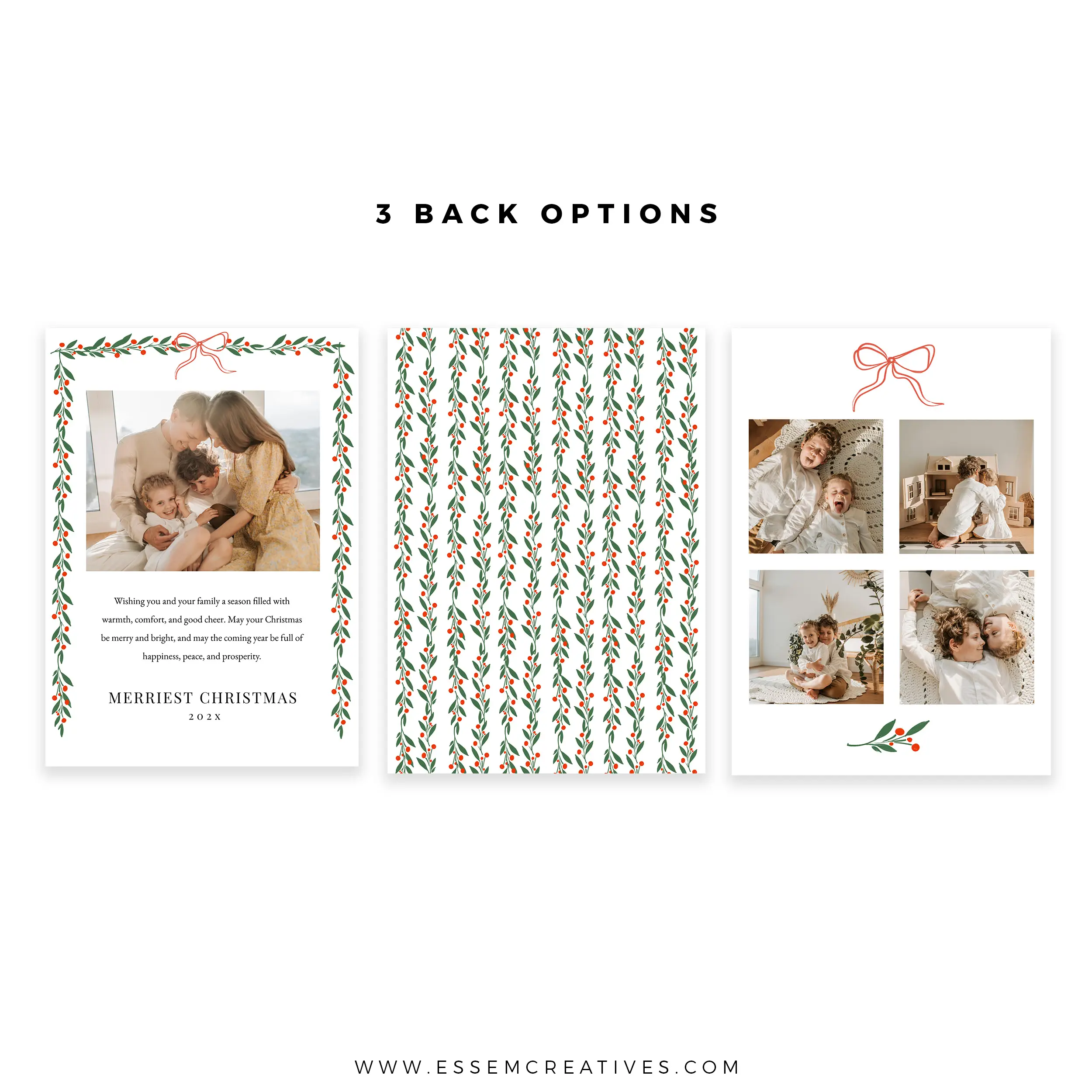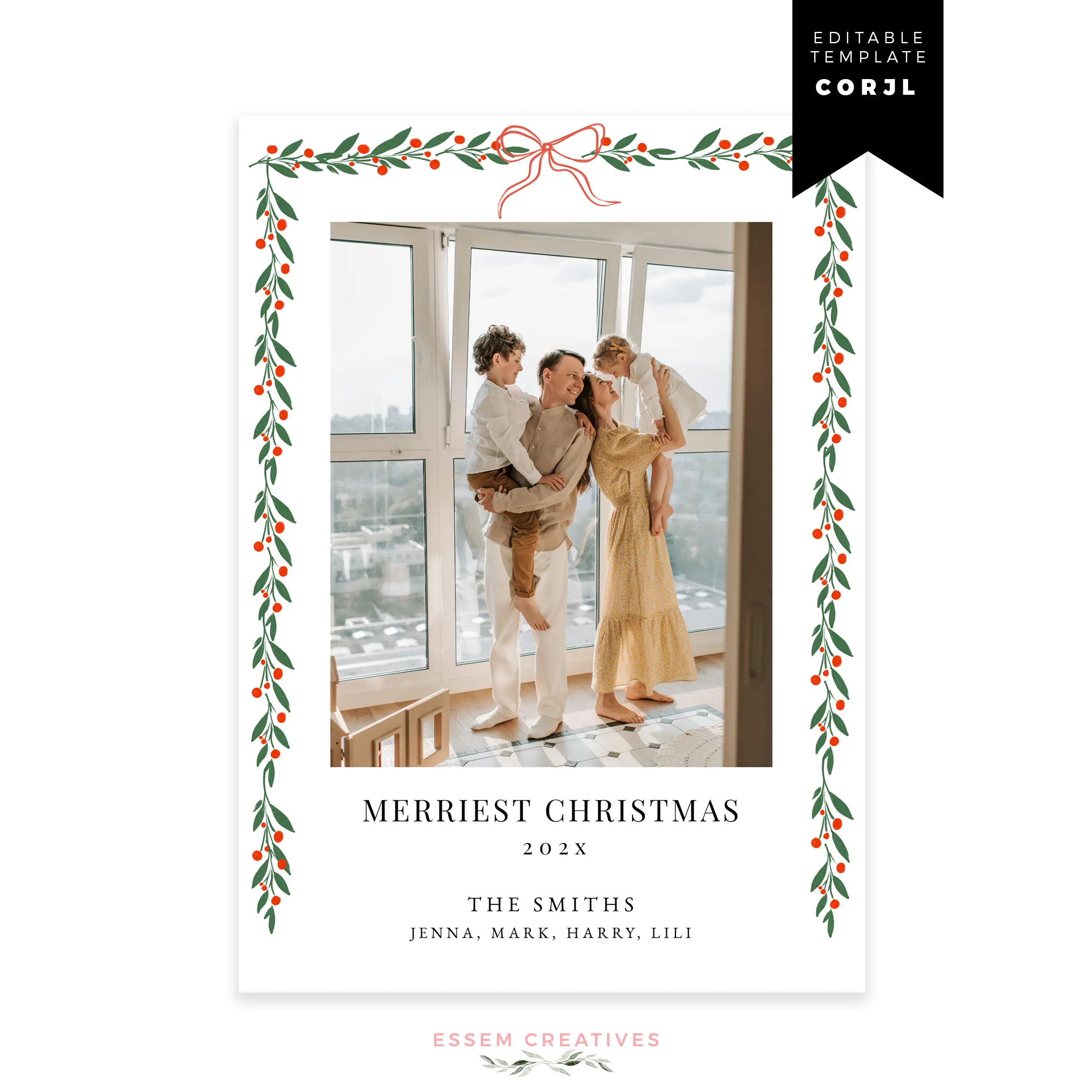 Printable Dainty Greenery Garland Frame Christmas Photo Card Template, Editable Red Bow Delicate Winter Greens Holiday Card, Corjl 516