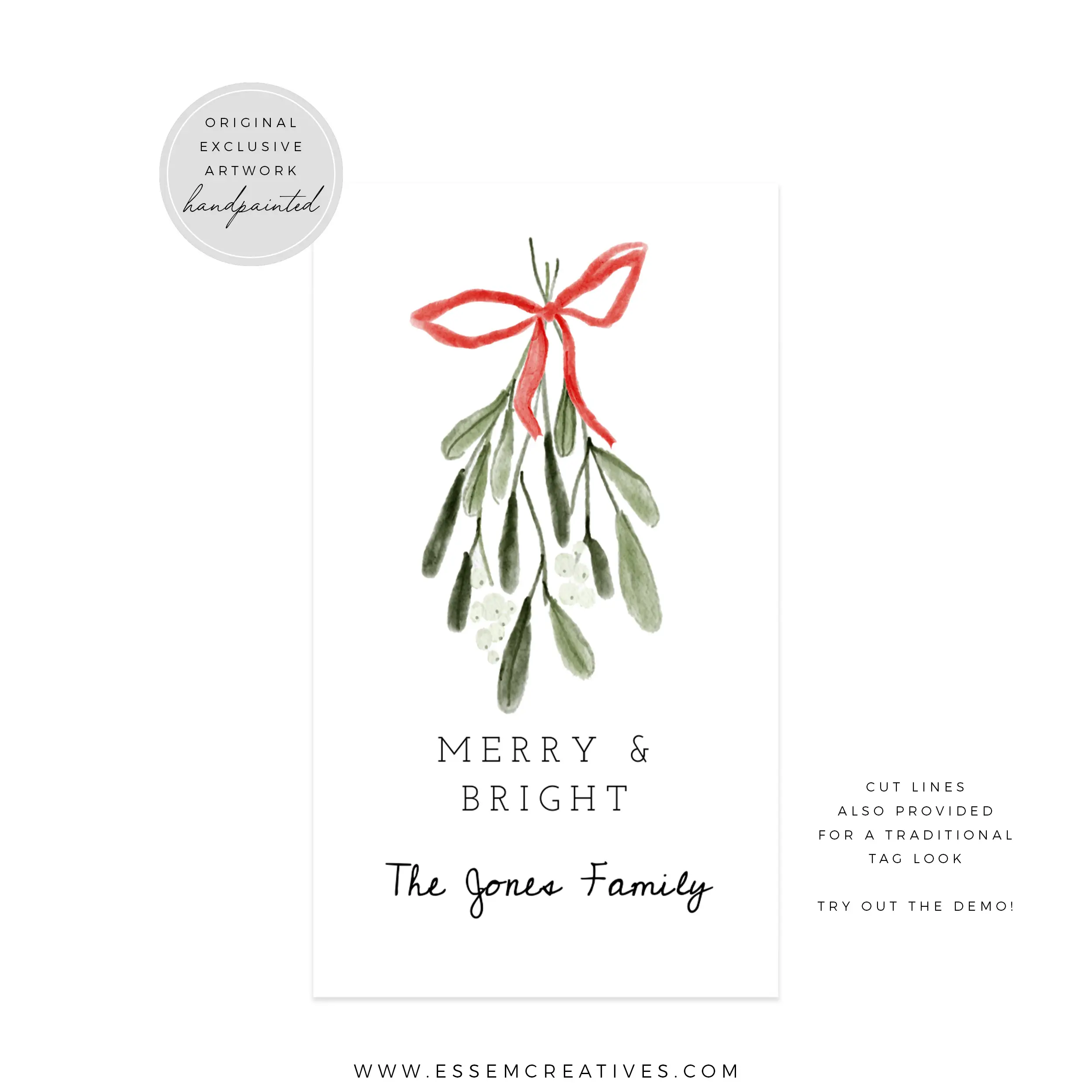 Printable Mistletoe Christmas Gift Tag Template, Editable Cute Modern Whimsical Holiday Gift Tag, Greenery and Bow Gift Label, Corjl 516