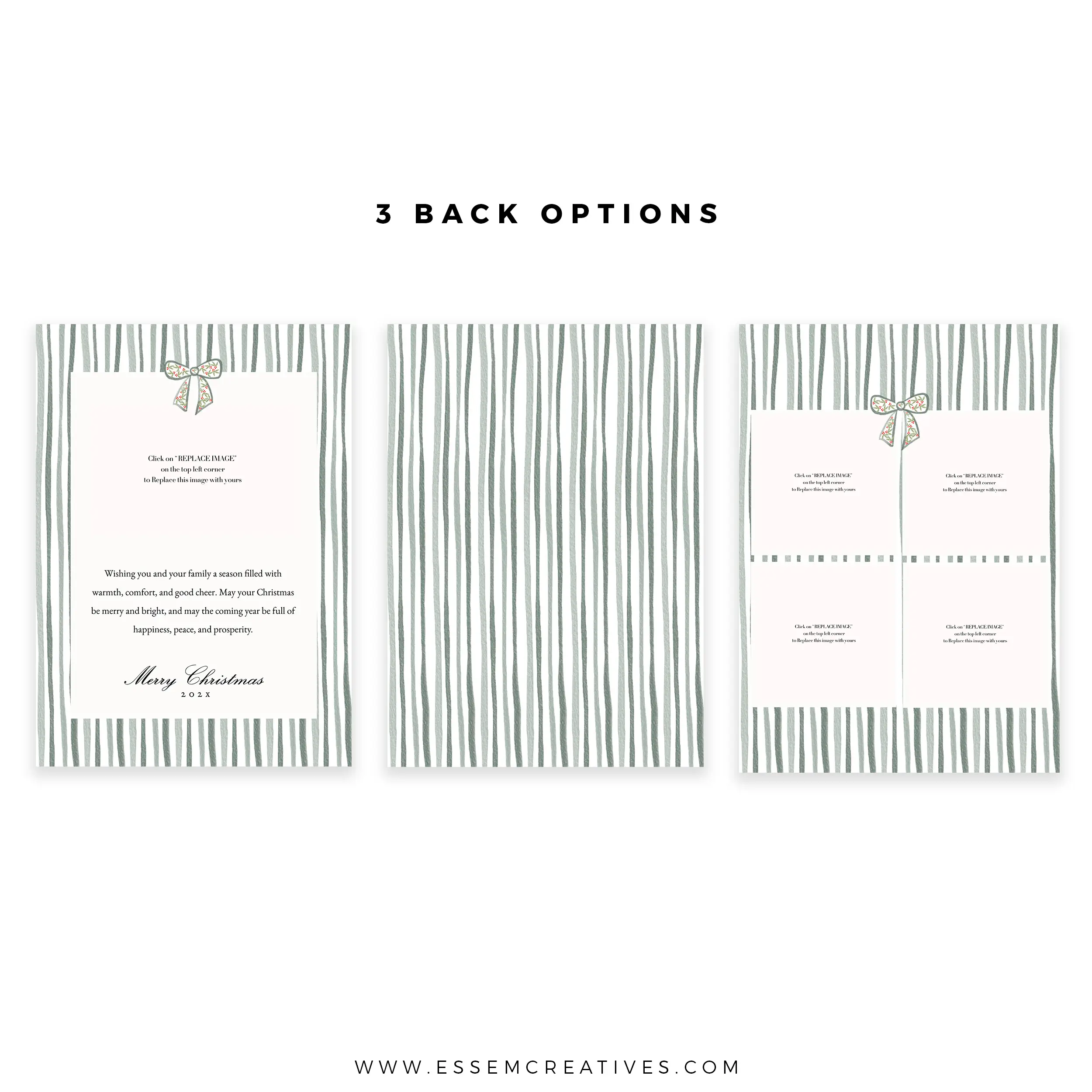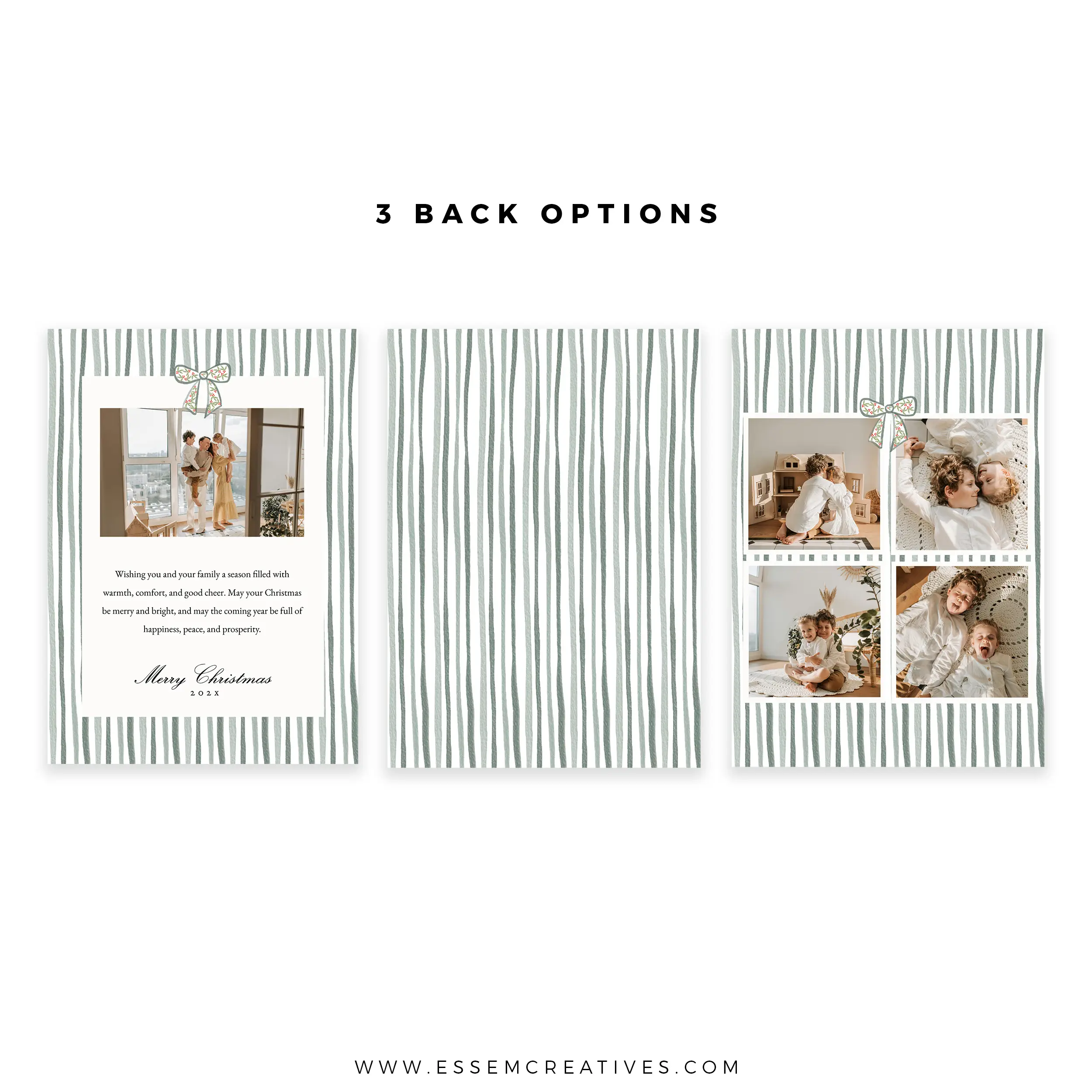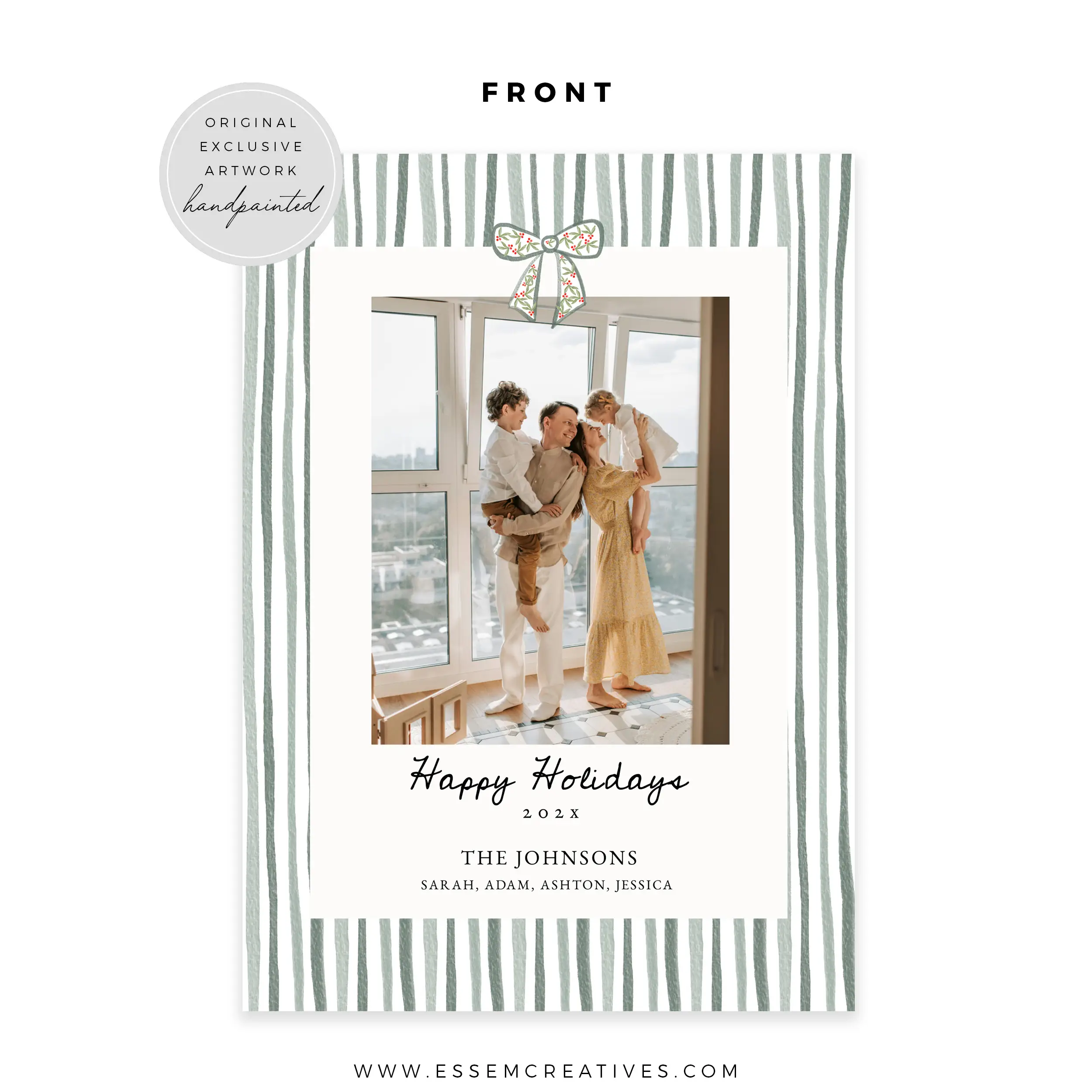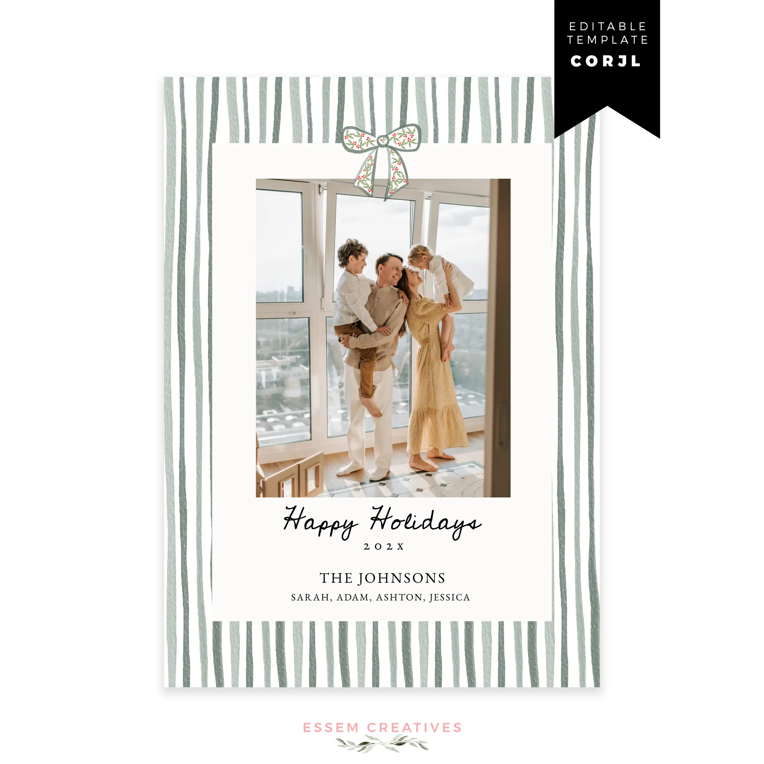 Printable Whimsical Stripes and Bow Christmas Card Template, Editable Holiday Photo Card Template, Modern Hand Drawn Green Card, Corjl 516