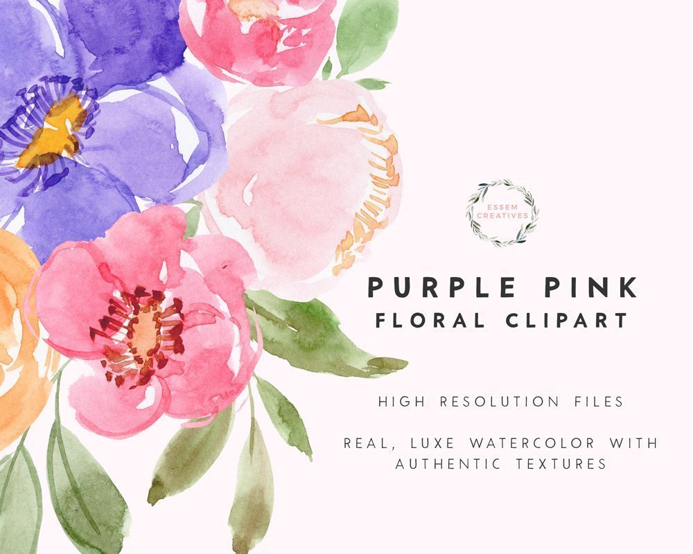 This is a set of hand painted bold and bright modern watercolor florals in shades of purple, pink and orange. These are perfect for use in wedding invitations, bridal shower invites, birthday stationery, other stationery, logos & branding, website banners & headers, business cards, packaging materials, art prints, coffee mugs, etc.