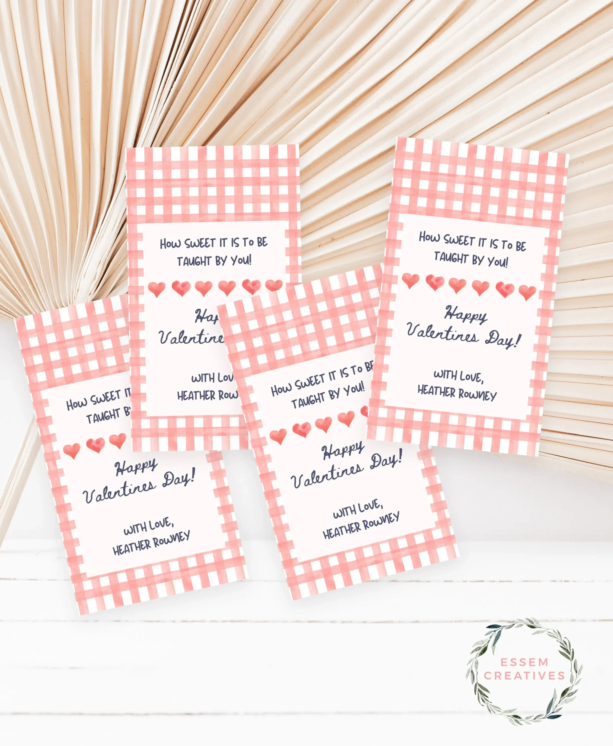 Teacher Valentine Gift Tag Template, Modern Preppy Simple Editable Gift Label for School Teacher with checks and hearts | edit with CANVA
