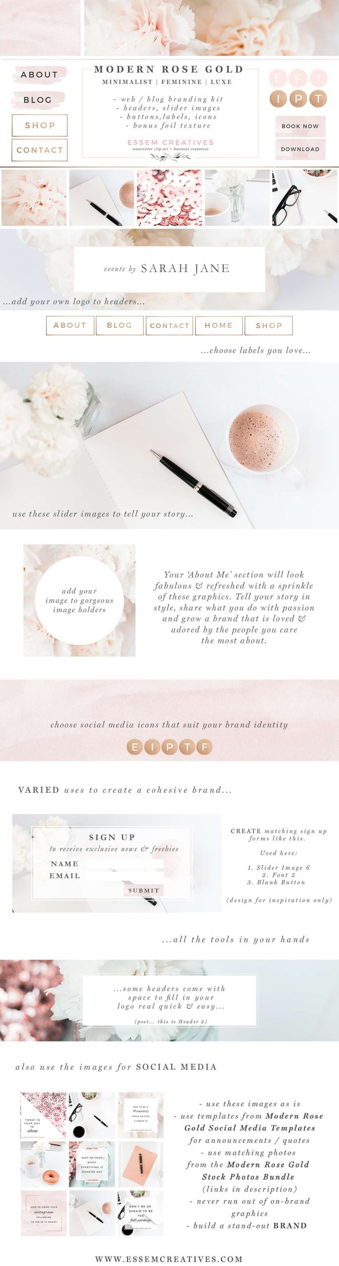 Modern Rose Gold Web Blog Branding Kit is a set of clean & minimalist graphics & images to personalise your website or blog. If you are a blogger or solopreneur looking to brand your website / blog, or just spruce up your existing website, this is the perfect product for you. Your download includes:
