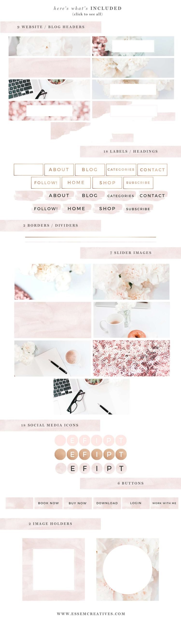 Website Branding Kit, Floral Pink Peach Rose Gold Theme, Blogger Design, WordPress Blog Header, Social Media Icons, Buttons, Labels, Borders