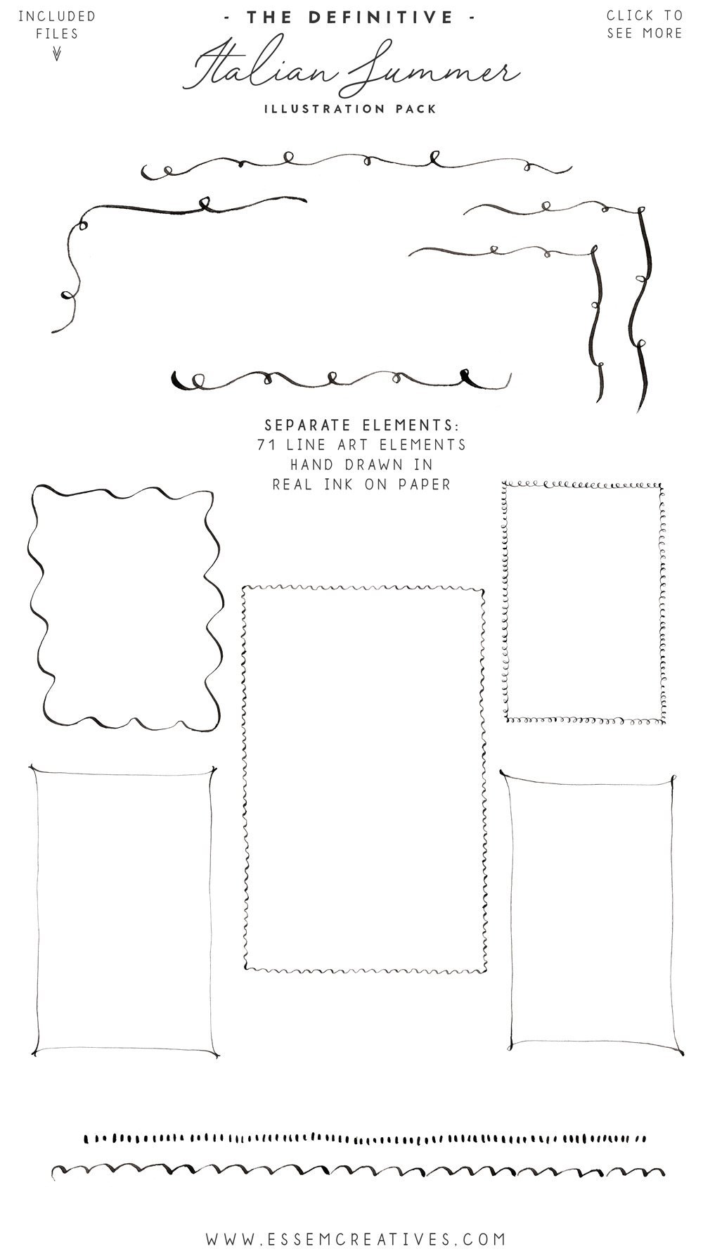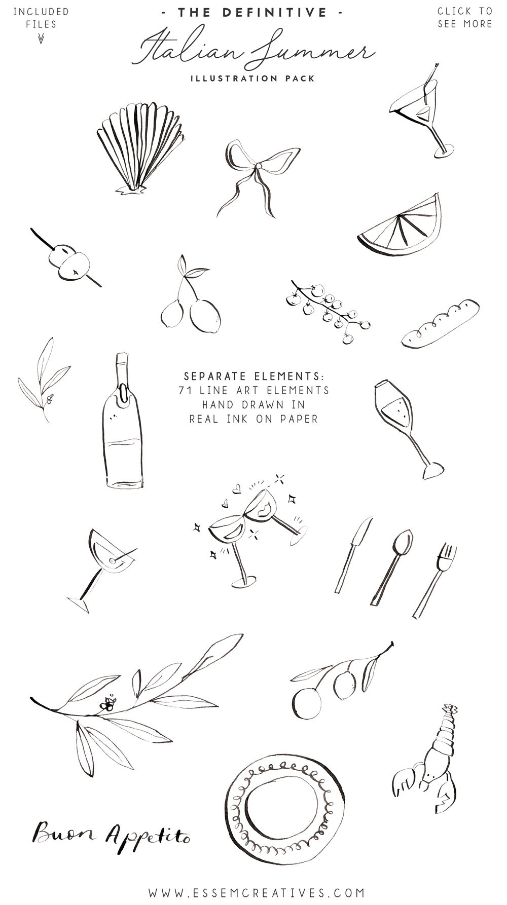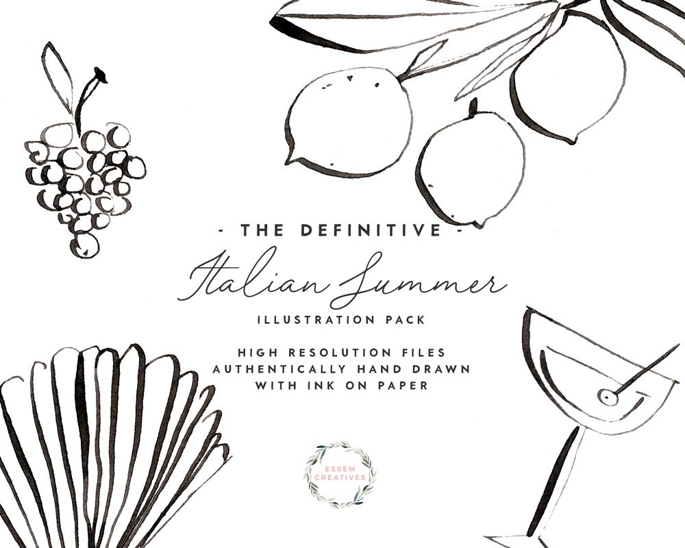 This is a set of hand drawn line art drawings and doodles in the La Dolce Vita / Amalfi / Italian Summer theme. These are perfect for use in wedding invitations, bridal shower invites, birthday stationery, other stationery, logos & branding, website banners & headers, business cards, packaging materials, art prints, coffee mugs, etc.